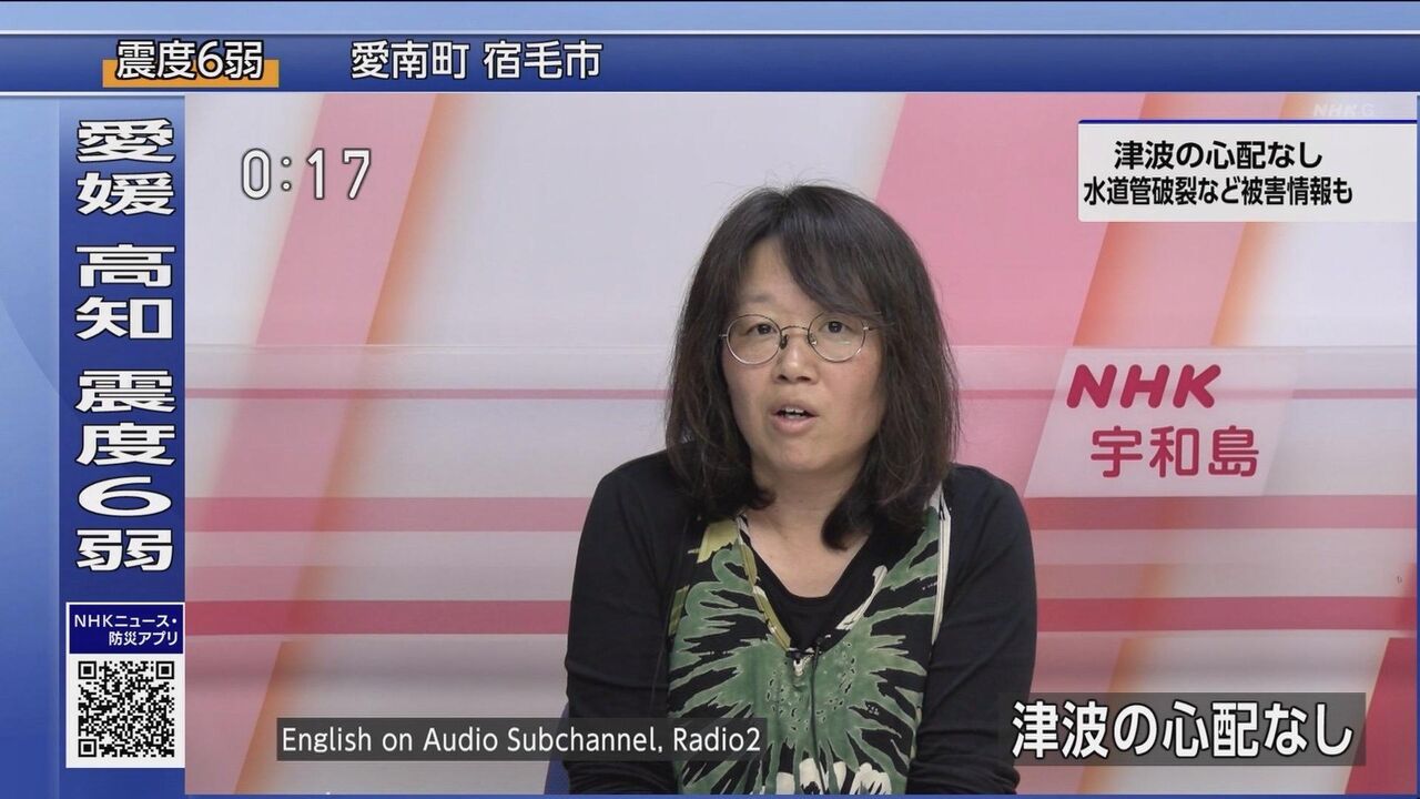 NHKの中川安奈アナウンサーが17日深夜、四国地方で発生した最大震度6弱の大地震に関連し、NHK広島放送局からの実況を行った。