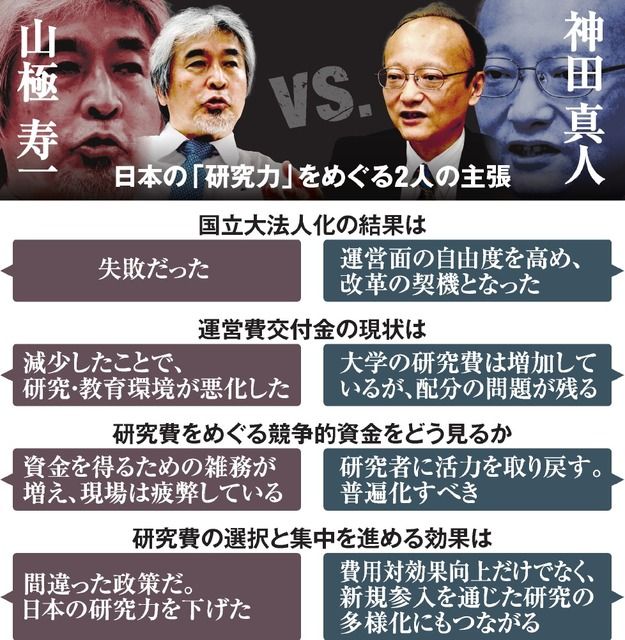 日本の「研究力」の低下が指摘されている。その原因は何か。国が進める競争政策に、問題はないのか――。国立大学協会会長で京都大総長の山極寿一さん、国の予算をあずかる財務省主計局次長の神田真人さんに聞いた。山極さんは「研究費の『選択と集中』政策は間違いだ」と主張。これとは逆に、神田さんは「競争がなければ、日本は廃虚になってしまう」と訴える。